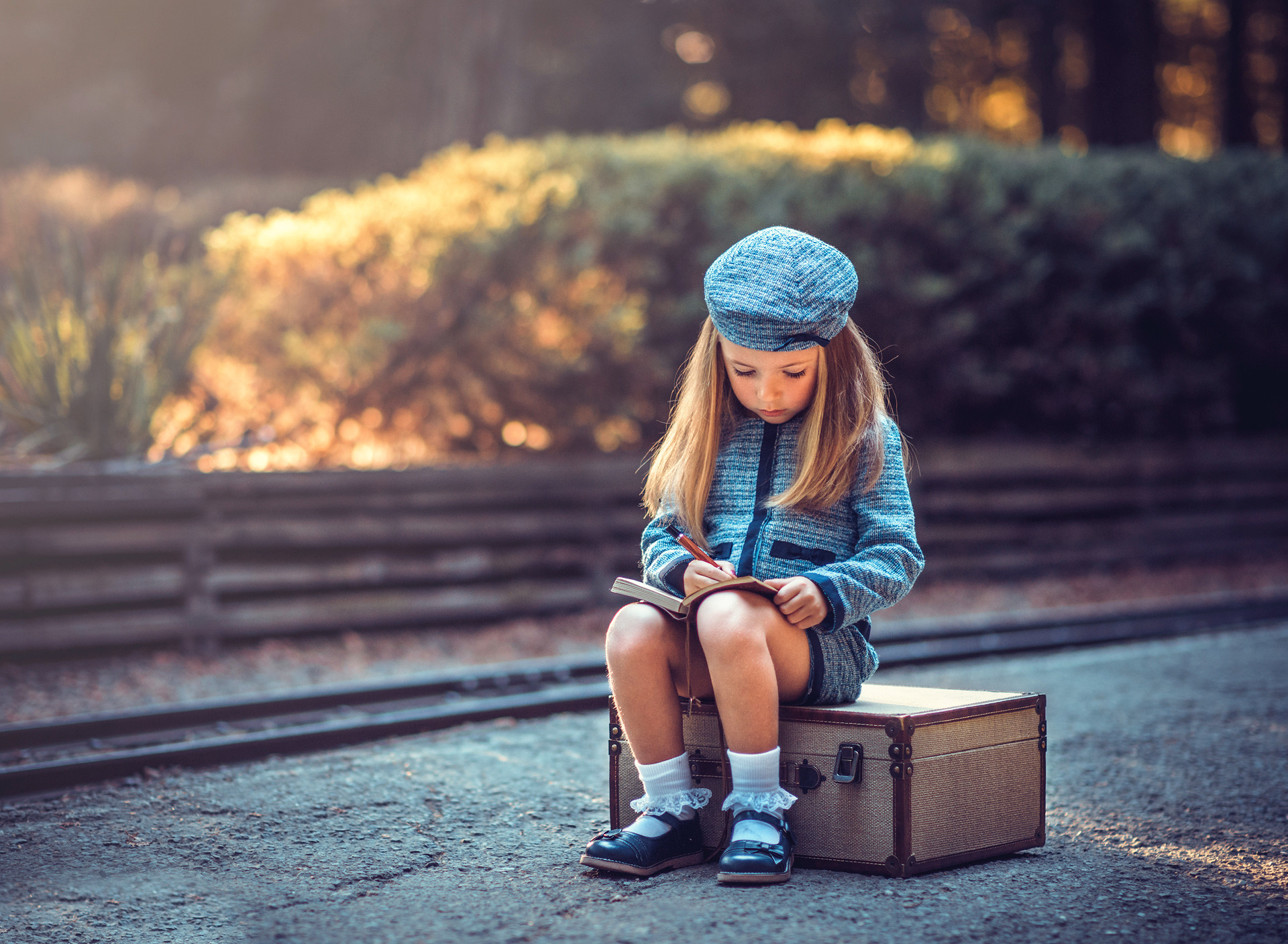 Обои дівчинка, перон, чемодан, зошит для рабочего стола.