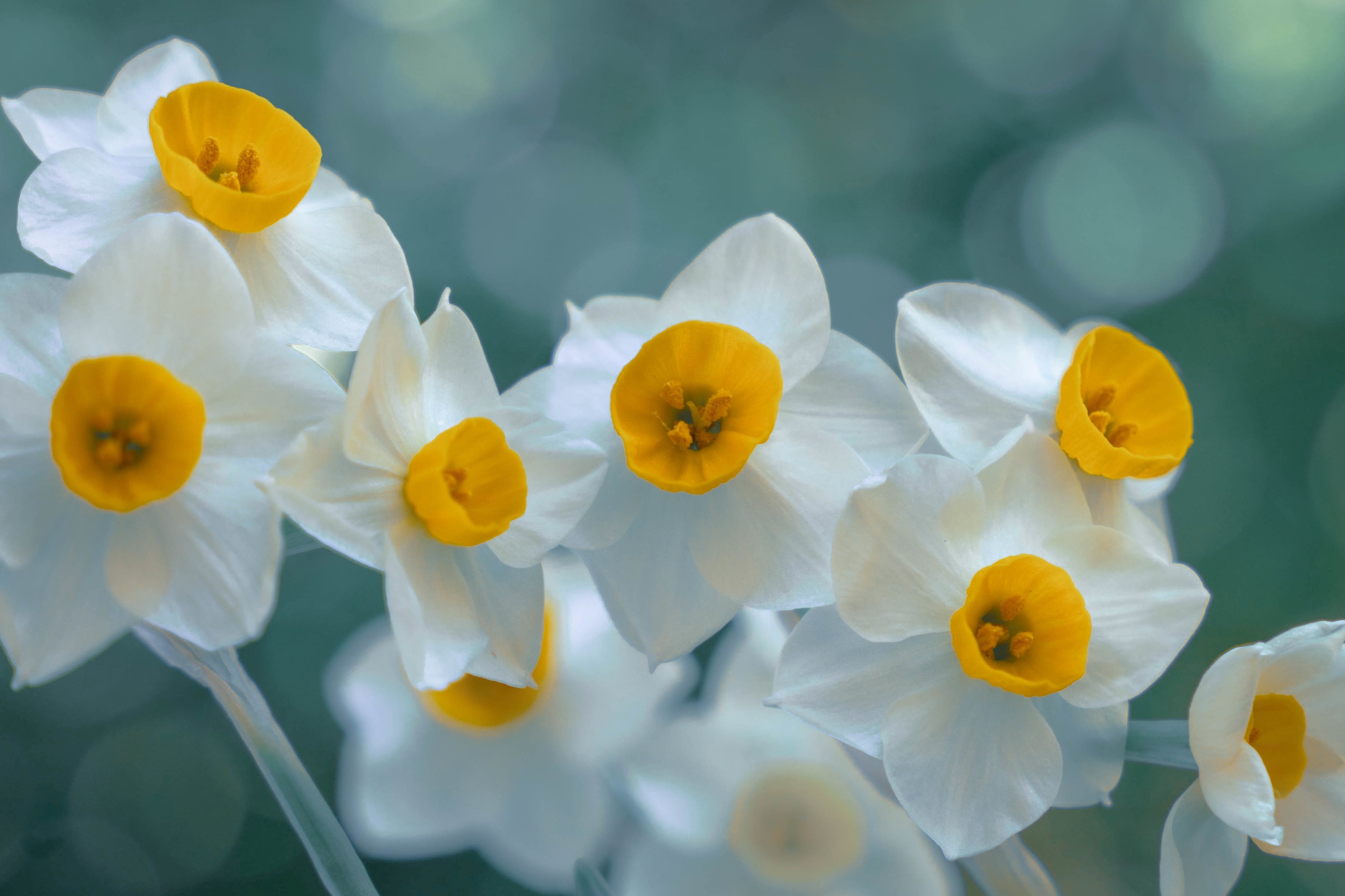 Обои макро, весна, белые, клумба, фон, нарциссы, боке для рабочего стола.